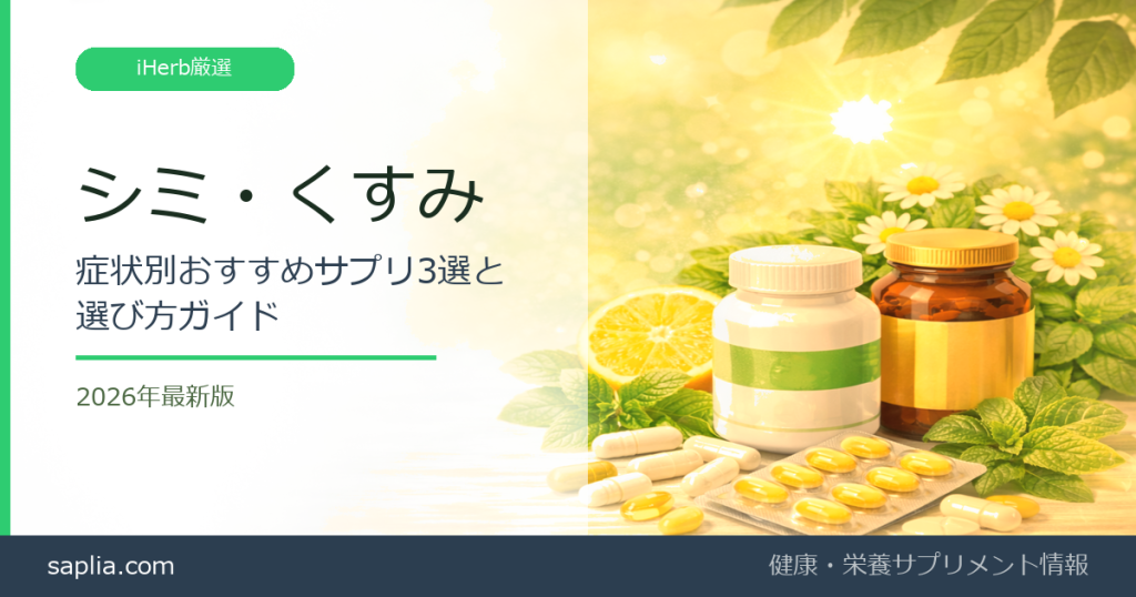 シミ・くすみが気になる方必見。原因となる栄養不足や生活習慣を解説し、トラネキサム酸・アスタキサンチン・グルタチオンなどの注目成分とiHerbおすすめ商品3選を紹介します。